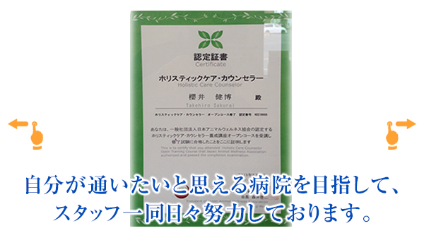 話のできないペットと飼い主様の間に立って、お互いの生活がより良いものになるように病気の治療だけでなく、何気ないご相談も気軽にしていただける病院を目指します。自分が通いたいと思える病院を目指してスタッフ一同日々努力しております。